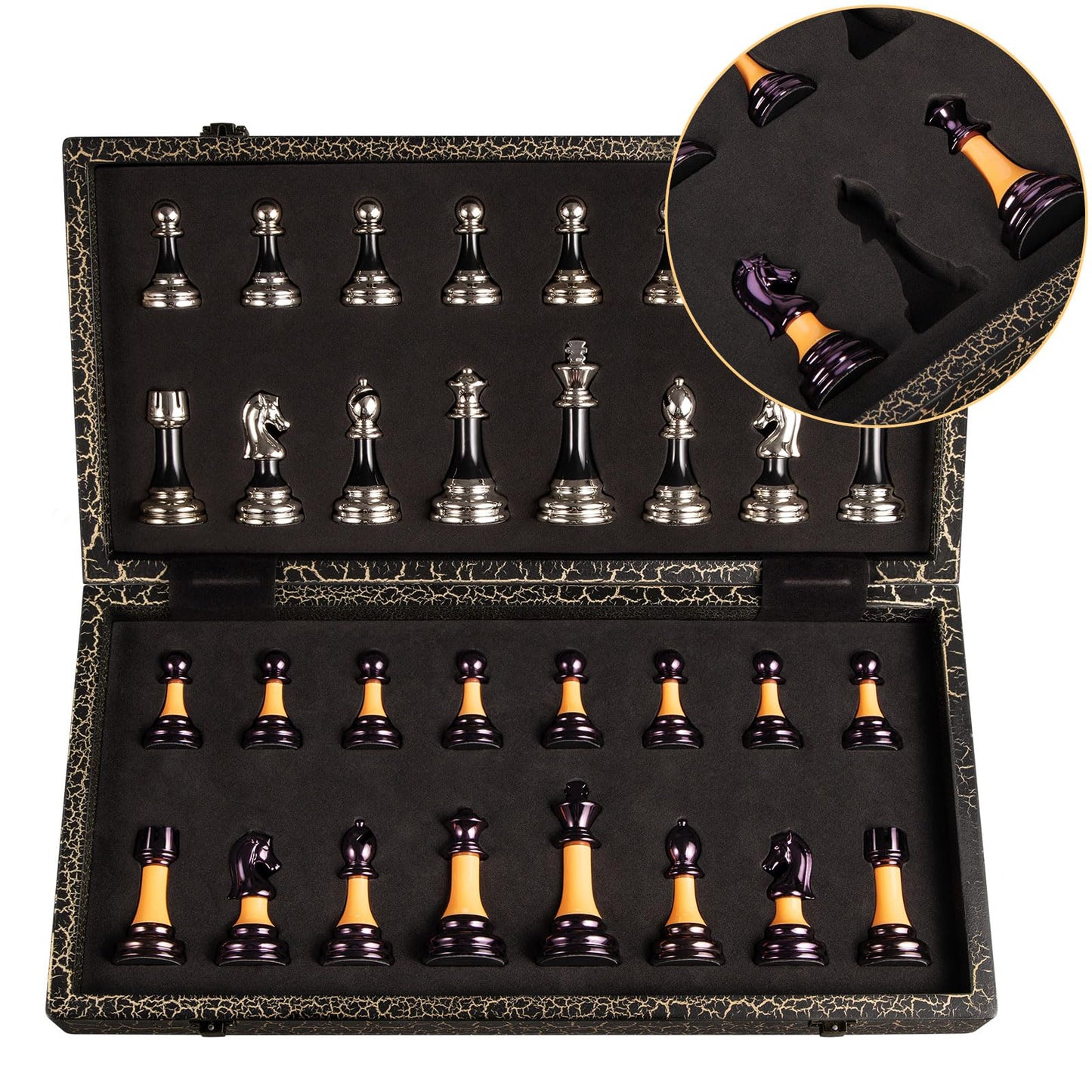 - Compartimento de almacenamiento no empotrado incorporado: el práctico juego de tablero de ajedrez almacena cada pieza de ajedrez en una ranura de ajedrez separada, que no solo protege las piezas de ajedrez de colisión y desgaste, sino que también evita que se agite y pierda piezas de ajedrez al transportar. Es fácil de almacenar después de jugar al ajedrez. No habrá desorden, las bisagras de latón permiten que la tabla se abra y cierre de forma flexible sin que la tabla se deforme. Muy adecuado para principiantes y tú que no sabes cómo almacenar