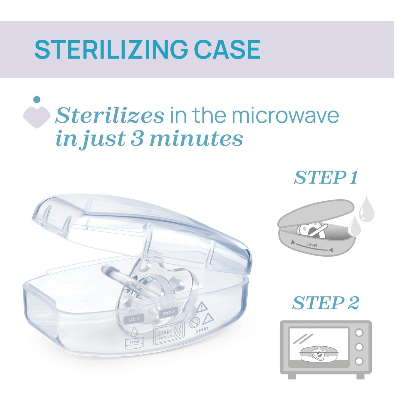 Detalles: Silicona suave extra suave y delicada con la piel, no deja marcas en el rostro. La base suave y fina permite que los labios se cierren de forma natural. La forma similar a la de un pecho estimula la succión al tiempo que mejora las características de suavidad. Permiten el paso del aire y reducen el estancamiento de la saliva. Los chupetes Chicco PhysioForma entrenan todas las funciones vitales de la boca para un crecimiento saludable: SUCCIONAR, RESPIRAR, TRAGAR, MASTICAR. PhysioForma® es la forma anatómico-funcional exclusiva de todos los chupetes Chicco, diseñada para promover y estimular correctamente todas las funciones vitales de la boca durante la succión no nutritiva manteniendo la posición fisiológica de la lengua, en lo alto del paladar. La boca se define como un "confluente vital" porque dentro de la cavidad bucal se activan y desarrollan numerosas funciones vitales, con diferentes interconexiones y efectos fundamentales para el crecimiento saludable del niño: RESPIRAR, SUCCIONAR, SABOREAR, MASTICAR. El chupete anatómico y funcional Chicco PhysioForma puede desempeñar un papel crucial en esta dinámica: tiene un impacto positivo en el desarrollo de la boca y sus funciones, porque permite el correcto posicionamiento de la lengua y, por lo tanto, garantiza el desarrollo armonioso del paladar y su estimulación correcta y profunda. El nuevo estuche esterilizador permite desinfectar los chupetes en el microondas, eliminando el 99,9% de los gérmenes en tan solo 3 minutos. PASO 1: Llene con agua hasta la línea, inserte los chupetes dentro del estuche y cierre la tapa; PASO 2: Esterilizar en el microondas durante 3 minutos a 750 vatios.