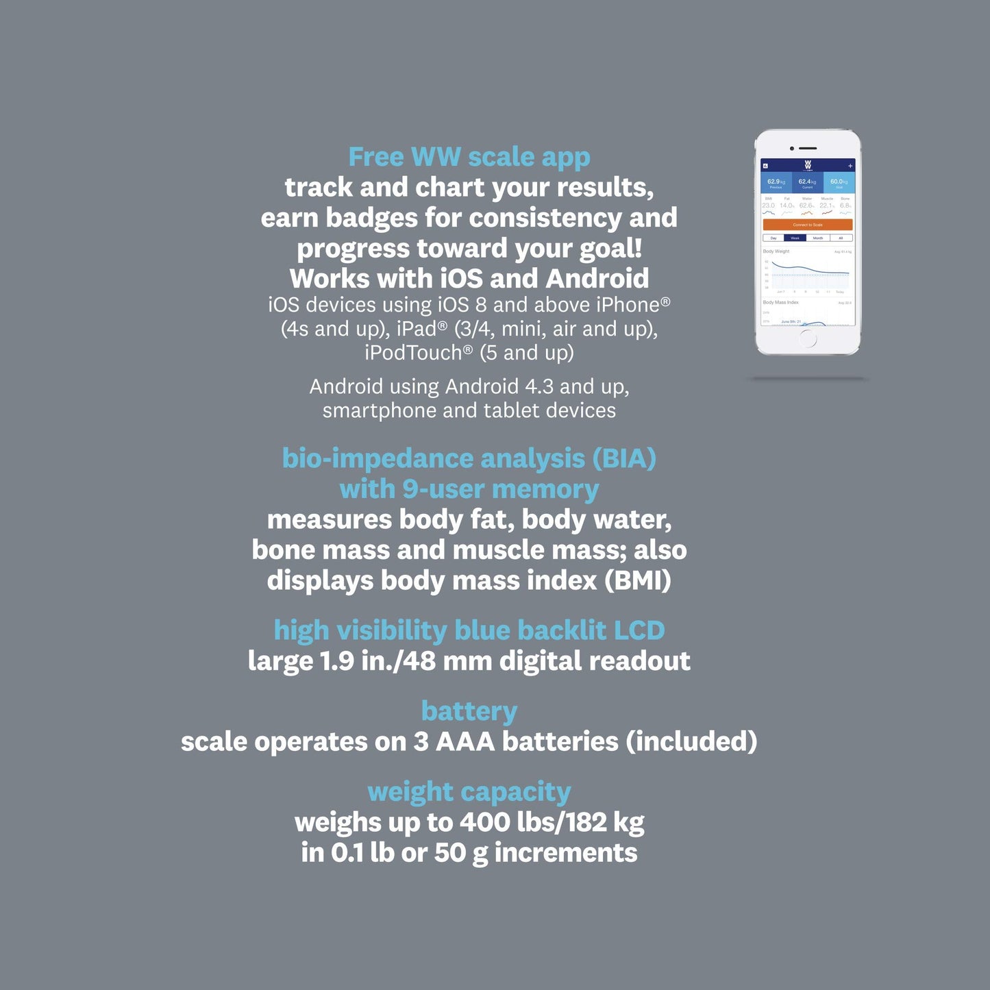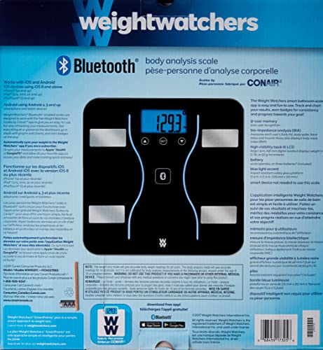 Detalles: Te presentamos esta báscula weightwatchers (de control de peso) de Conair con Bluetooth. Es una báscula inteligente que realiza análisis corporales y que es compatible con la app de Conair para control de peso (weightwatchers). Así te resultará más fácil usarla, será más divertido y podrás hacer un seguimiento de tu peso.Esta báscula ofrece análisis de bioimpedancia (Bia): mide la grasa corporal de cada usuario, el agua corporal, la masa ósea y la masa muscular, y también muestra el índice de masa corporal (IMC). Todo esto se puede ver de forma resumida en el escritorio del dispositivo o puedes ver cada apartado más a fondo y estudiar los gráficos y las tablas, ¡y ganar insignias mientras lo haces! Esta báscula sincroniza automáticamente tu peso con la app de control de peso (weight Watchers) o también se puede sincronizar con Apple health o Google fit. Deja que tu app favorita tenga acceso a todos tus datos y haz que el seguimiento de tu evolución sea más fácil. Tiene una memoria con capacidad para 9 usuariosPantalla LCD de alta visibilidad y retroiluminada - Grande, 48 mm - muestra el peso en formato digitalcon incrementos de 50 gLa app de control de peso weightwatchers es fácil y divertida de usar.Registra y analiza tus resultados, podrás ganar insignias en caso de que seas consistente en tus esfuerzos y realices progresos. Empieza hoy mismo: app de control de peso, sincronización automática de tus datos. ¡Hoy mismo puedes empezar! La báscula funciona con tres pilas AAA (incluidas).