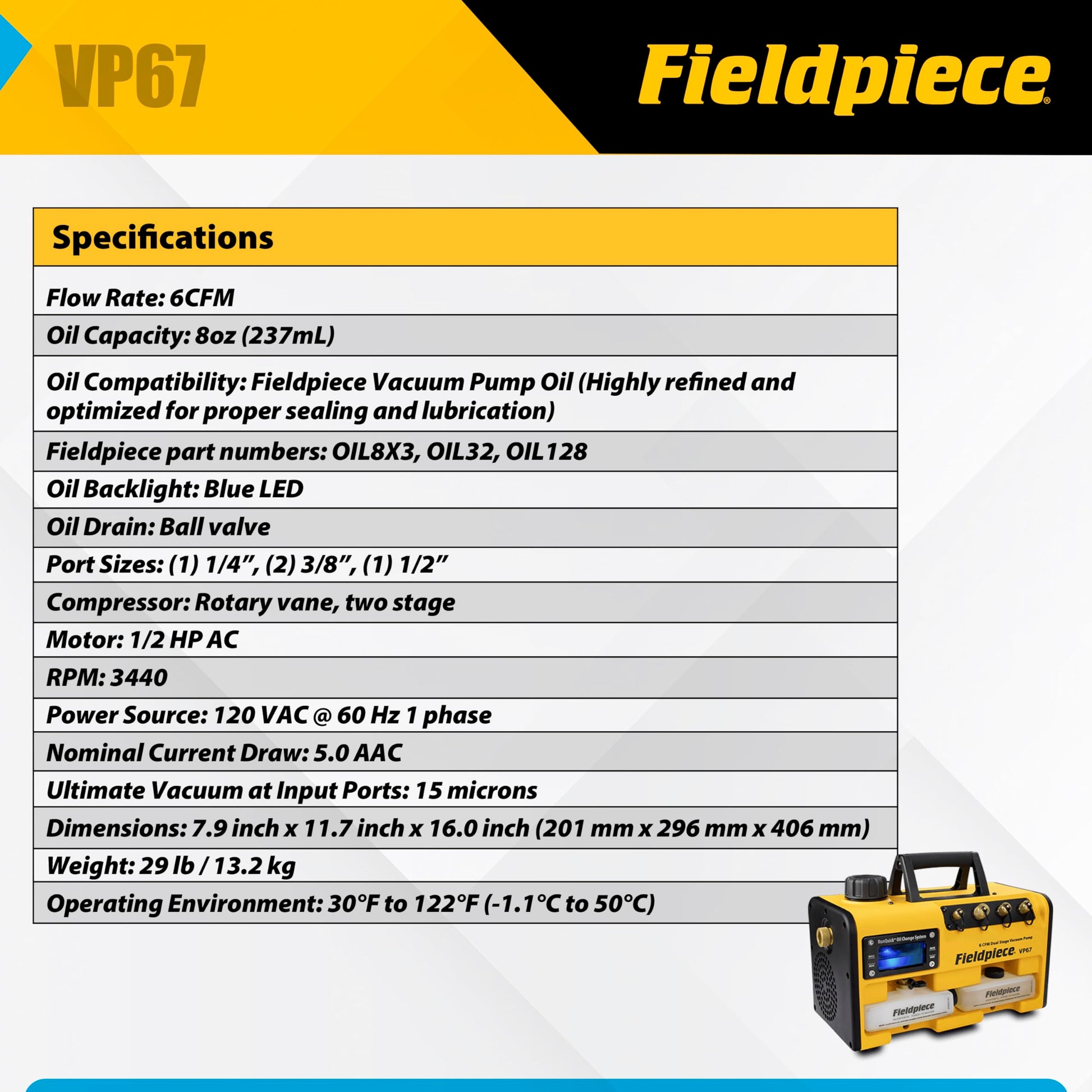Fieldpiece VP67 - Bomba de aspiradora - 6 CFM, motor CC de 1/2 HP, sistema de cambio de aceite RunQuick - Portátil - Herramienta profesional HVAC - Compatible con A2L