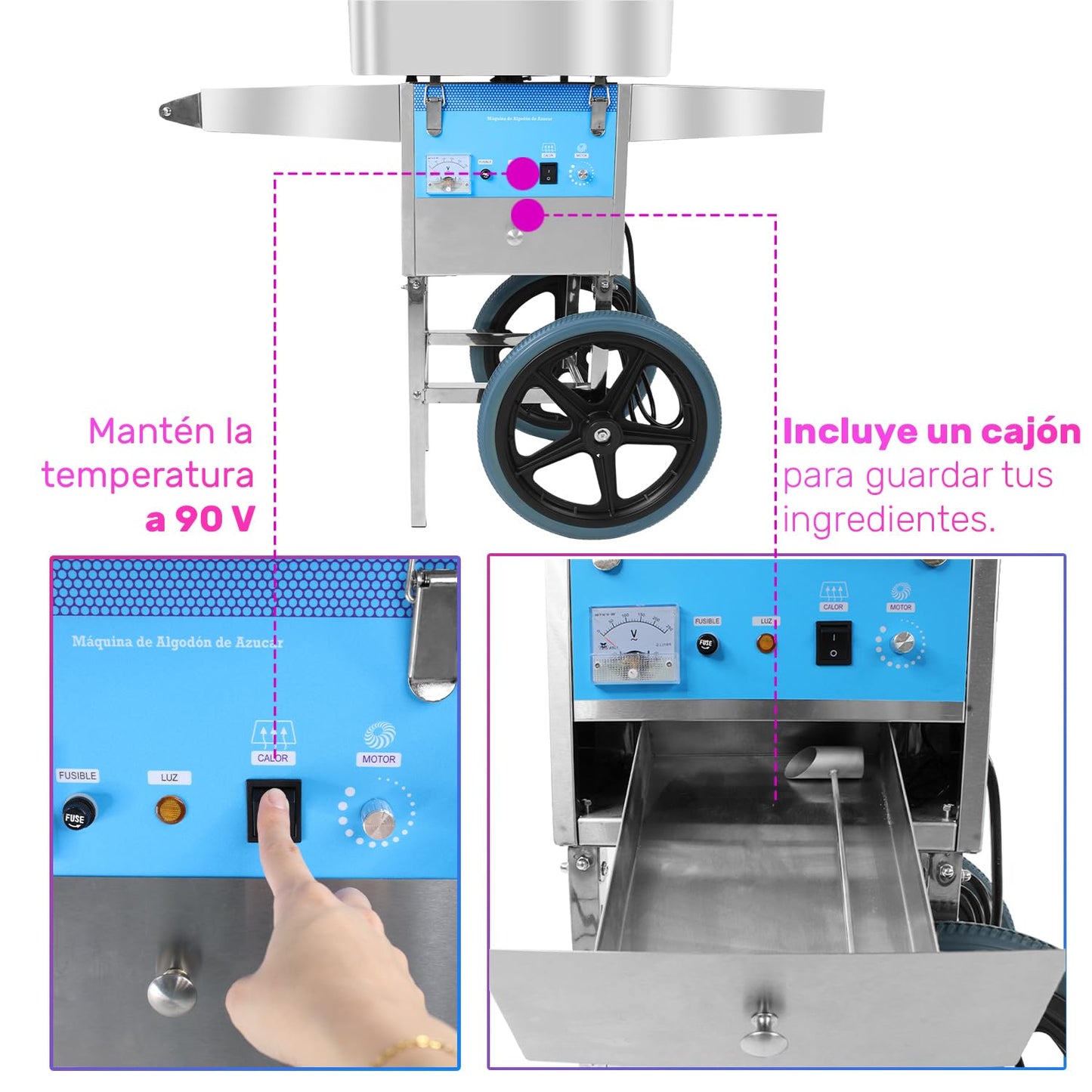 - Súper CAPACIDAD. La máquina de algodones de Gutstark está fabricada en su totalidad con acero inoxidable, tiene una olla de 52 cm de diámetro; perfecta para elaborar grandes piezas ideales para la venta o incluso piezas pequeñas para acompañar una mesa de dulces. Además, incluye un cajón con 3 compartimentos para guardar los saborizantes o la cuchara medidora y tener todo al alcance de tus manos.